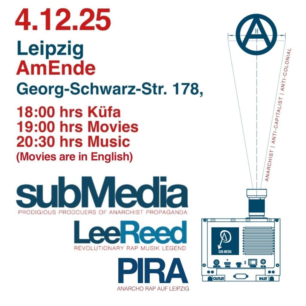 It’s been well over a decade since subMedia crossed the Atlantic. A lot has changed since then. There’s been some rather enormous political developments. Not to mention a veritable glut of riots, uprisings and other moments of insurrectionary rupture. And we’ve been busy distilling this high-octane footage into a refined, uncut, revolutionary analysis, ideal for projecting on the walls of finer squats and social spaces. So we’re thrilled to announce that this November and December, as civilization continues to explode in a fiery spectacular shitstorm, the subMedia crew will be once again returning to the European subcontinent – to connect with rad people and organizations; learn about rad spaces and projects; host rad screenings and workshops; and burn that circle-A shit into our host’s eye-holes. We’ll be coming equipped with some classics from the vault, and reels from our newest documentary series InterRebellium. And to make things even sweeter, we’ll be joined on the first leg of the tour by one of our favourite anarchist rappers, Lee Reed. We don’t get over to Europe often. And fuck knows what things will look like in another 10-15 years. So please spread word. Restock the popcorn. We hope to see you there!